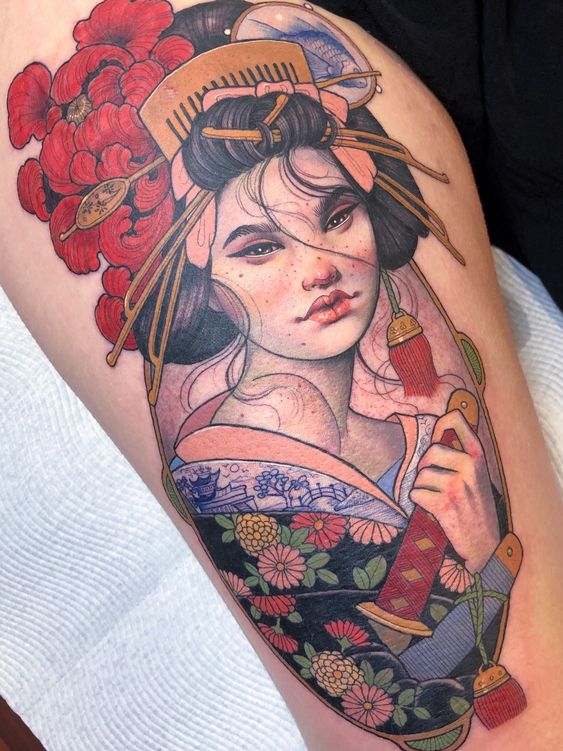 Quạt cầm tay: Quạt giấy là một phần không thể thiếu trong văn hóa biểu diễn của Geisha. Quạt trong hình xăm có thể tượng trưng cho sự khéo léo, tinh tế và sự kín đáo trong cảm xúc.