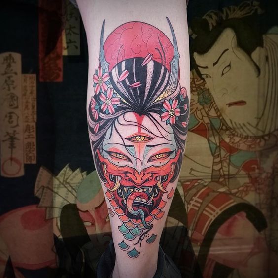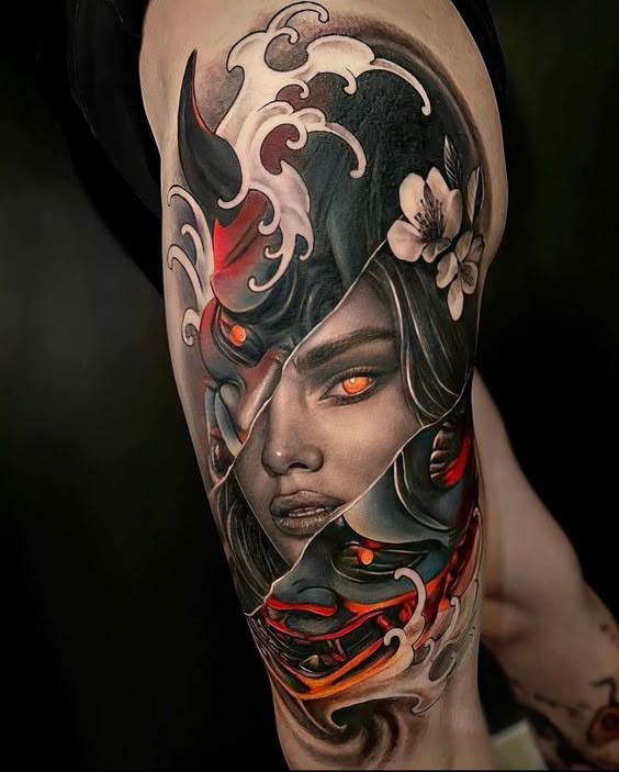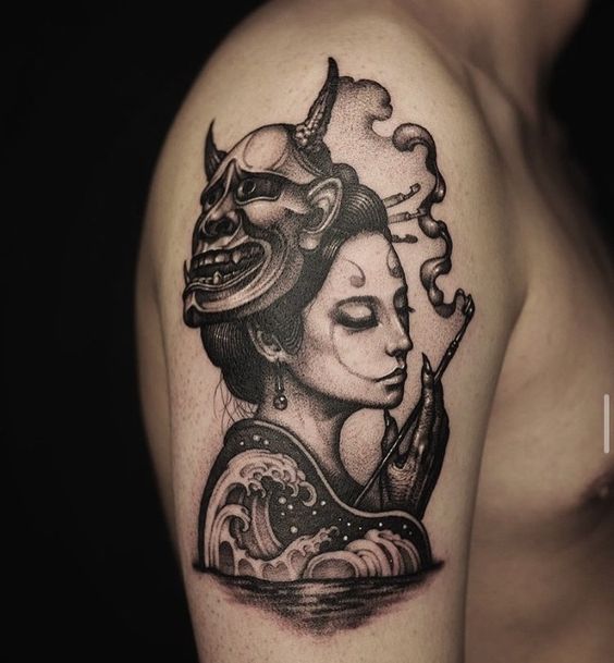 Mặt nạ kịch Noh: Mặt nạ trong kịch Noh, một loại hình nghệ thuật biểu diễn truyền thống, thường được kết hợp với hình xăm Geisha để tạo ra sự bí ẩn và đa tầng cảm xúc trong nhân vật.