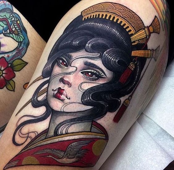 Phong cách hiện đại (Neo-Traditional): Phong cách này nhấn mạnh vào chi tiết và bóng đổ để tạo ra những hình ảnh sống động. Hình xăm Geisha theo phong cách hiện đại thường sử dụng nhiều màu sắc sáng, mang lại cảm giác chân thực và cuốn hút hơn, thể hiện sự phức tạp của nhân vật Geisha.